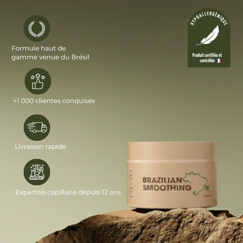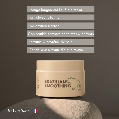 Soin lissant professionnel inspiré du Brésil, le Brazilian Smoothing BELYZIA associe algue rouge, kératine et protéine de soie pour discipliner les cheveux, réduire les frisottis et révéler une brillance miroir. Sa formule sans formol respecte la fibre capillaire et convient aux femmes enceintes et aux enfants. Résultat : des cheveux souples, lisses et soyeux pendant 3 à 6 mois, dans une approche naturelle et haut de gamme.